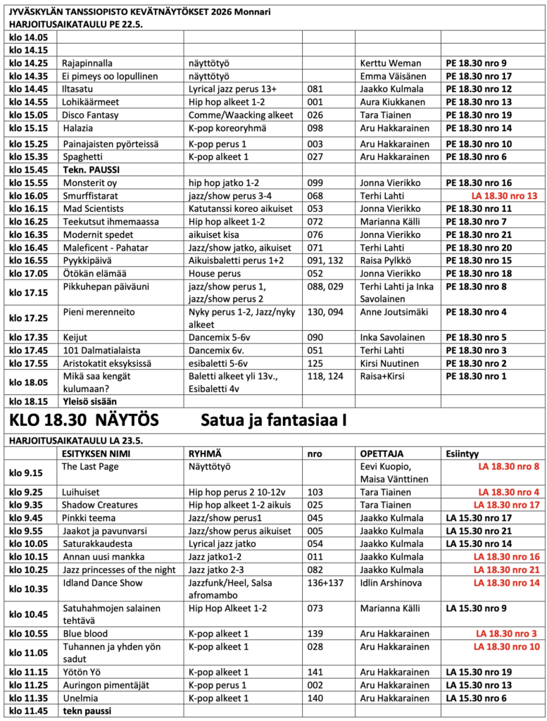 Kevätnäytökset 2026 harjoitusaikataulu