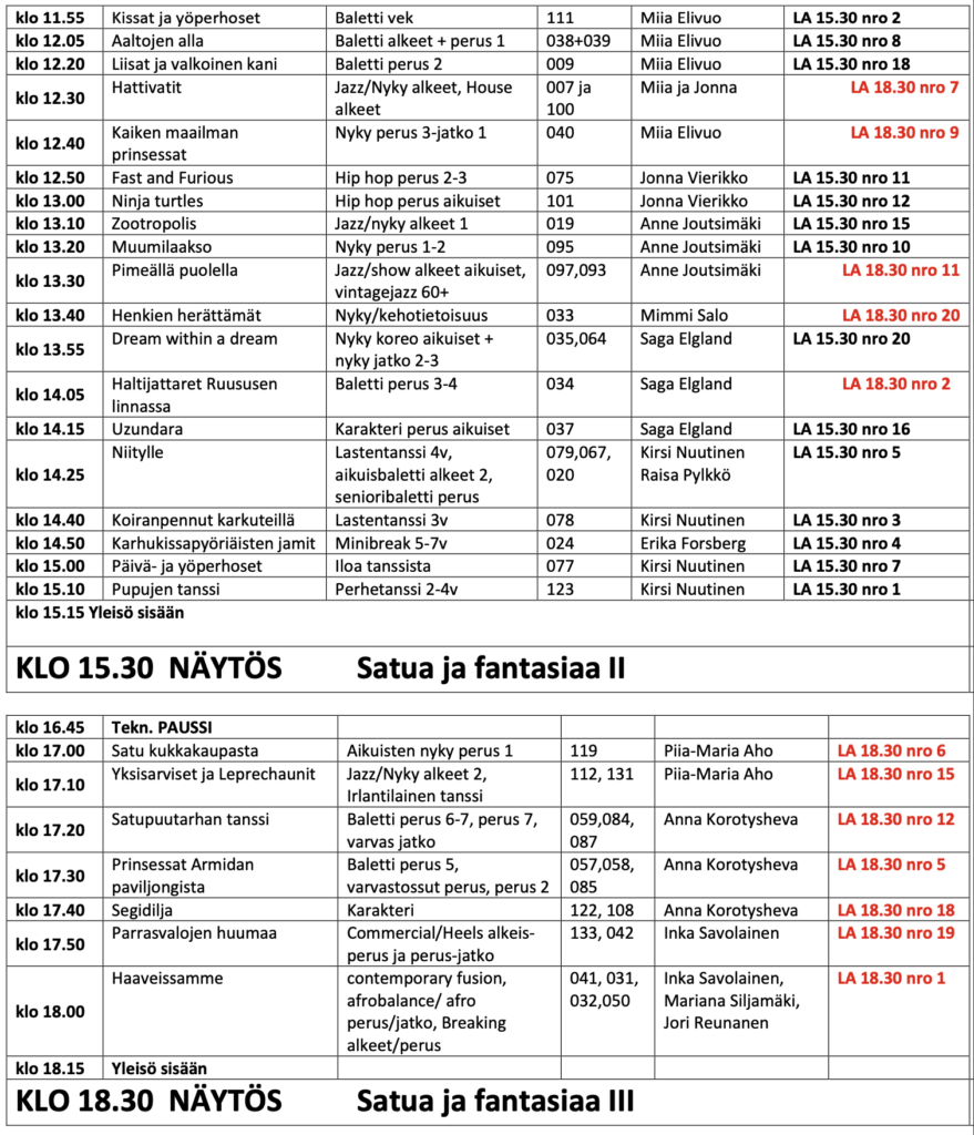Saavuthan ajoissa harjoituksiin, vähintään 15 min ennen oman ryhmäsi aikaa. Esiintyjien kulku Rautpohjankadun puoleisesta ovesta. Esitysasu vaihdetaan ryhmälle osoitetussa pukuhuoneessa. Ryhmän pukuhuoneen löydät käytävillä olevista listoista.